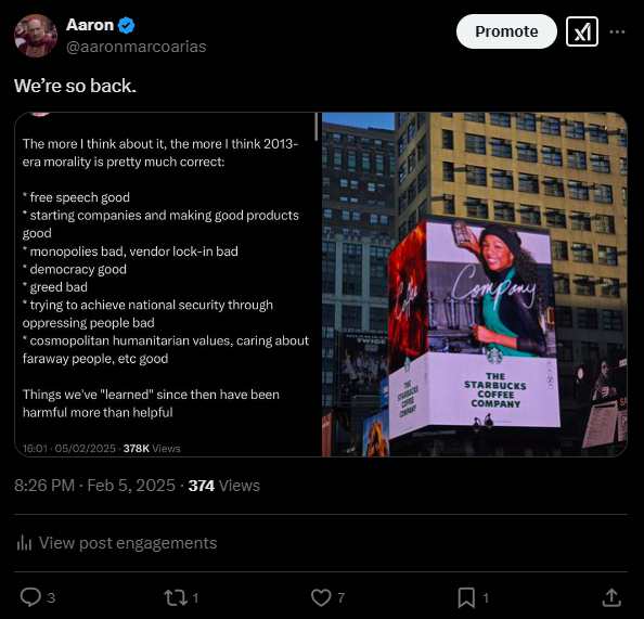 En el tweet que levanté, Vitalik celebra “la moral de la era 2013”. Traducido y descontextualizado, esto puede sonar ambiguo e incluso un poco estúpido. Pero quienes estuvimos ahí sabemos a lo que se refiere. Si bien sus pointers (“free speech is good”, etc.) son atinados, aquello a lo que se refiere como “moral (…) 2013” es más que la suma de sus partes. Es un tono, un optimismo crítico de las estructuras de poder, justificado por la esperanza de reformar, no de demoler. Es una lectura tanto del progresismo como de su oposición, mucho más naif y menos comprometida que la actual.