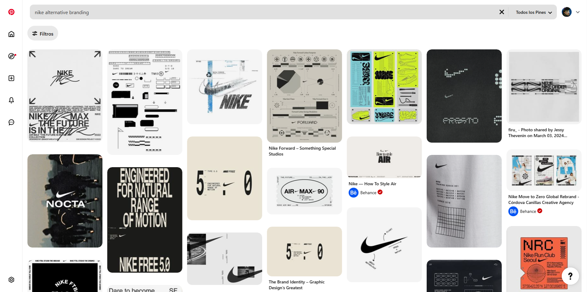 Are.na tiene un buscador mucho más caótico que Pinterest (red social análoga). Por ejemplo, si yo busco "nike alternative branding" en Pinterest, recibo un volumen generoso de material relevante: