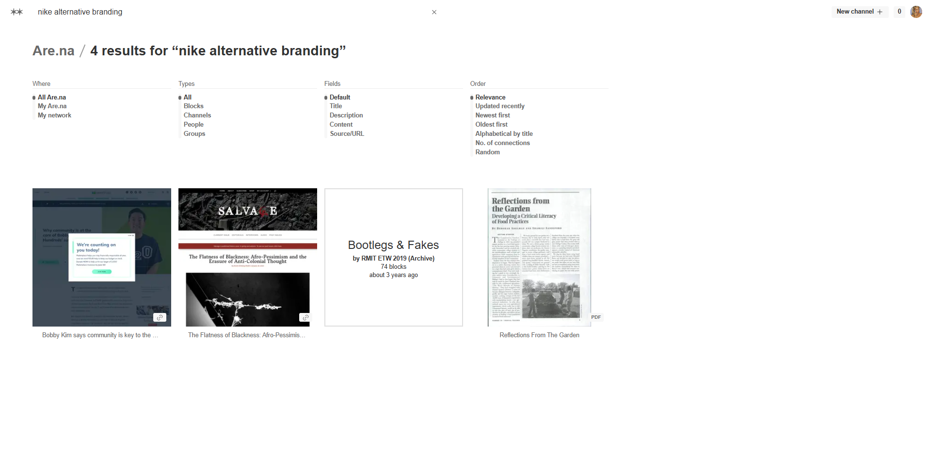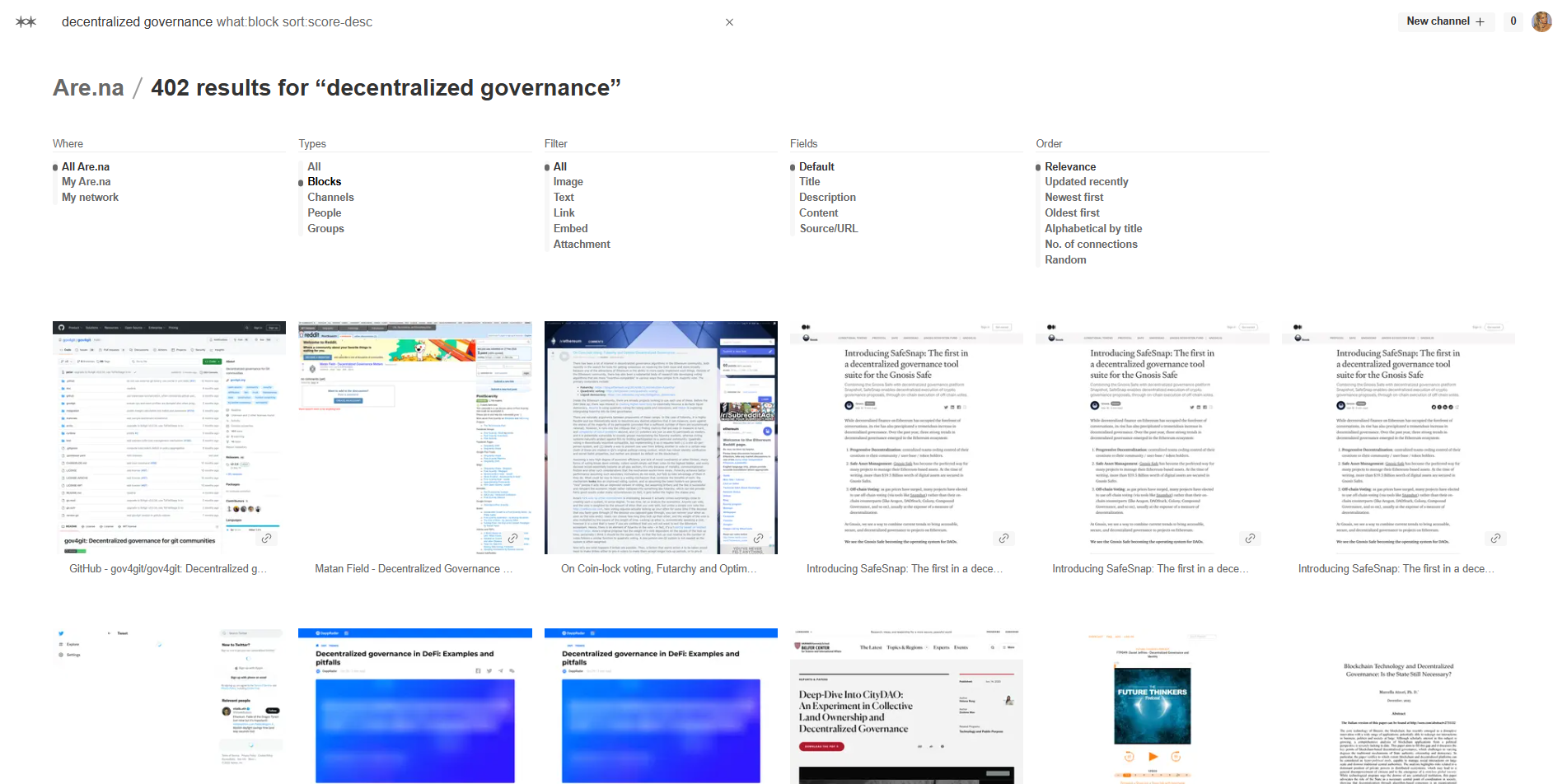 Are.na no es una red social para ir a buscar respuestas, es una plataforma para descubrir cosas raras e interesantes por accidente. Aún así, vale la pena alcarar que pueden encontrarse grandes cosas en el buscador de Are.na, siempre y cuando estés buscando ideas hiper-específicas. "Nike alternative branding" es algo que te puede dar Pinterest - o incluso Tumblr. Ahora, ¿Dónde vas a encontrar 402 recursos curados por especialistas sobre governanza decentralizada y 17 compilaciones dedicadas?