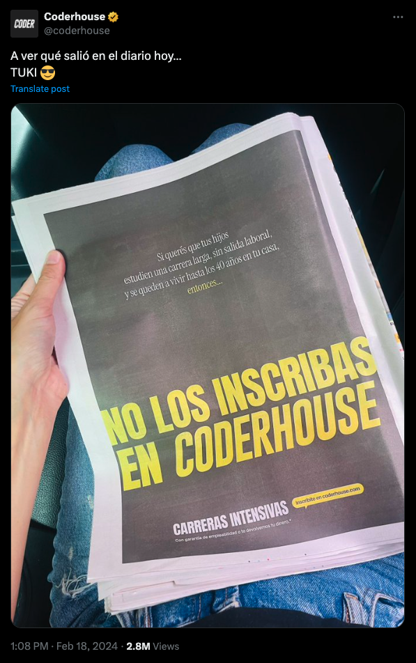 Desde hace meses, Coderhouse está en un raid de publicidad que se pretende contestataria. Aludí a ellos en una edición anterior, pero ahora, quiero compartirte este tuit en el que muestran su última campaña publicitaria en medios gráficos.