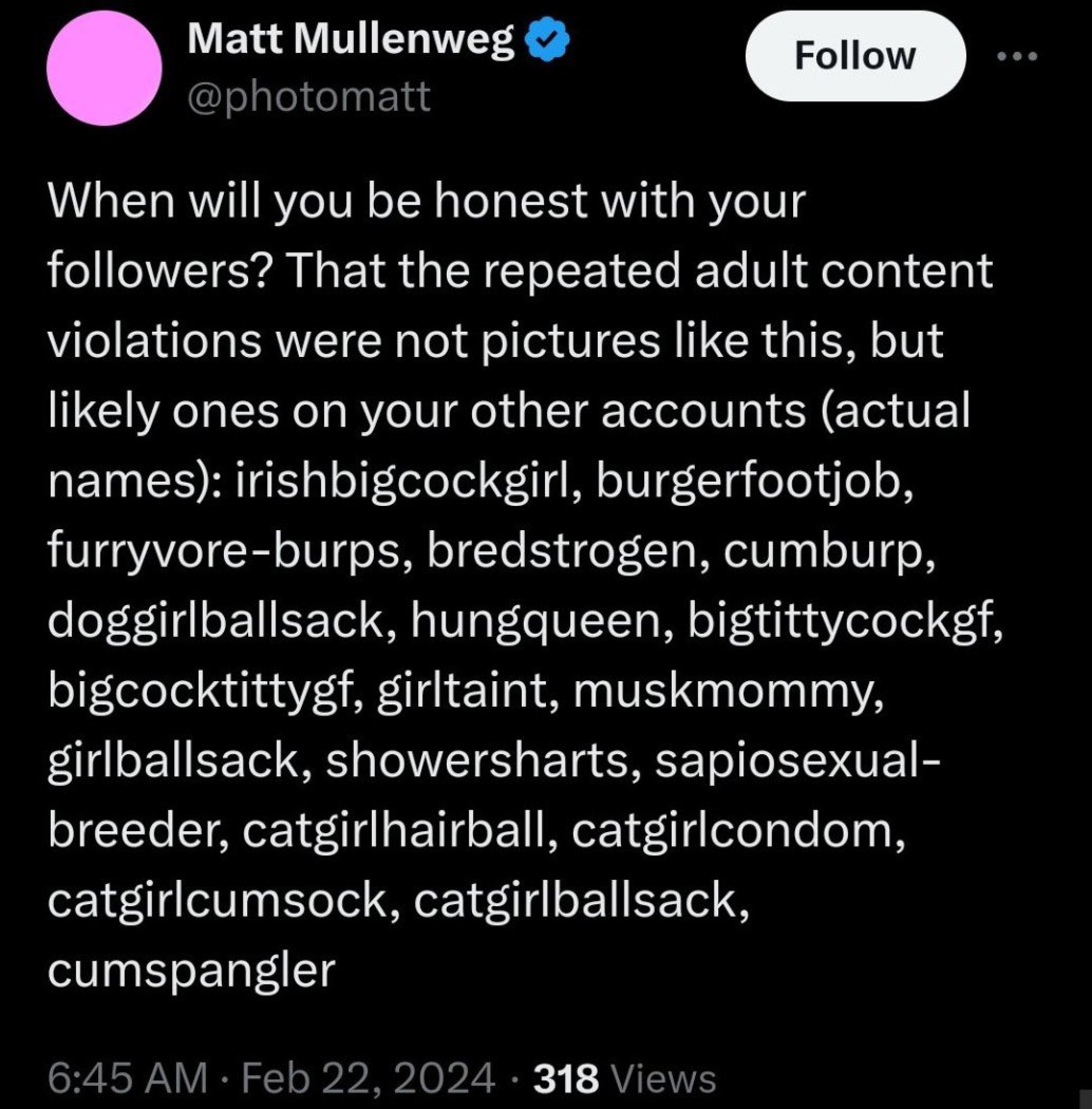 Ahora bien, utilizar información de su cuenta intentando “ganar un debate” en Twitter es cruzar una línea. No solamente Mullenweg está mostrando que es un Nenazo al que le entran todas las balas. Además, está demostrando que está dispuesto a gestionar irresponsablemente la información de los usuarios si una disputa personal lo requiere.