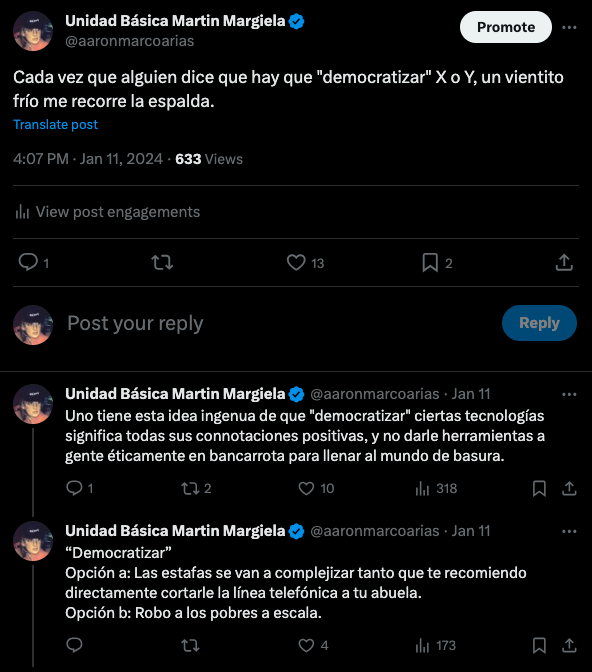 Hace un tiempo, comentaba en Twitter que la democratización de ciertas tecnologías (namely, las IA generativas) crea un clima peligroso y nocivo.