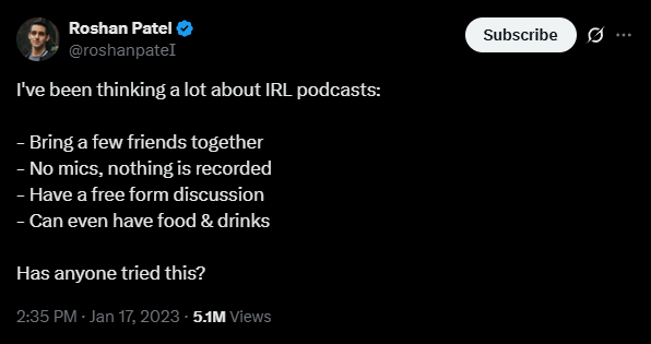 ¿Qué es un momento cultural? ¿Qué tan grande debe ser una audiencia para que algo sea "cultural" y no doméstico? ¿Cuándo un chiste privado se convierte en humor de nicho? Recuerdo aquel tuit donde alguien propuso producir un podcast sin cámaras ni micrófonos, que no se transmitiera en ningún sitio y no se monetizara.