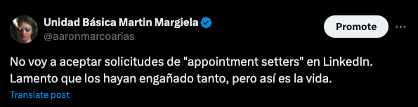 El appointment-setting como servicio que se vende al por mayor es una estafa. Es una estafa para los dueños de empresas B2B (buena parte de mi audiencia y casi todos mis clientes), y es una estafa para los pibitos a los que se les están vendiendo cursos de appointment-setting bajo promesas absurdas.