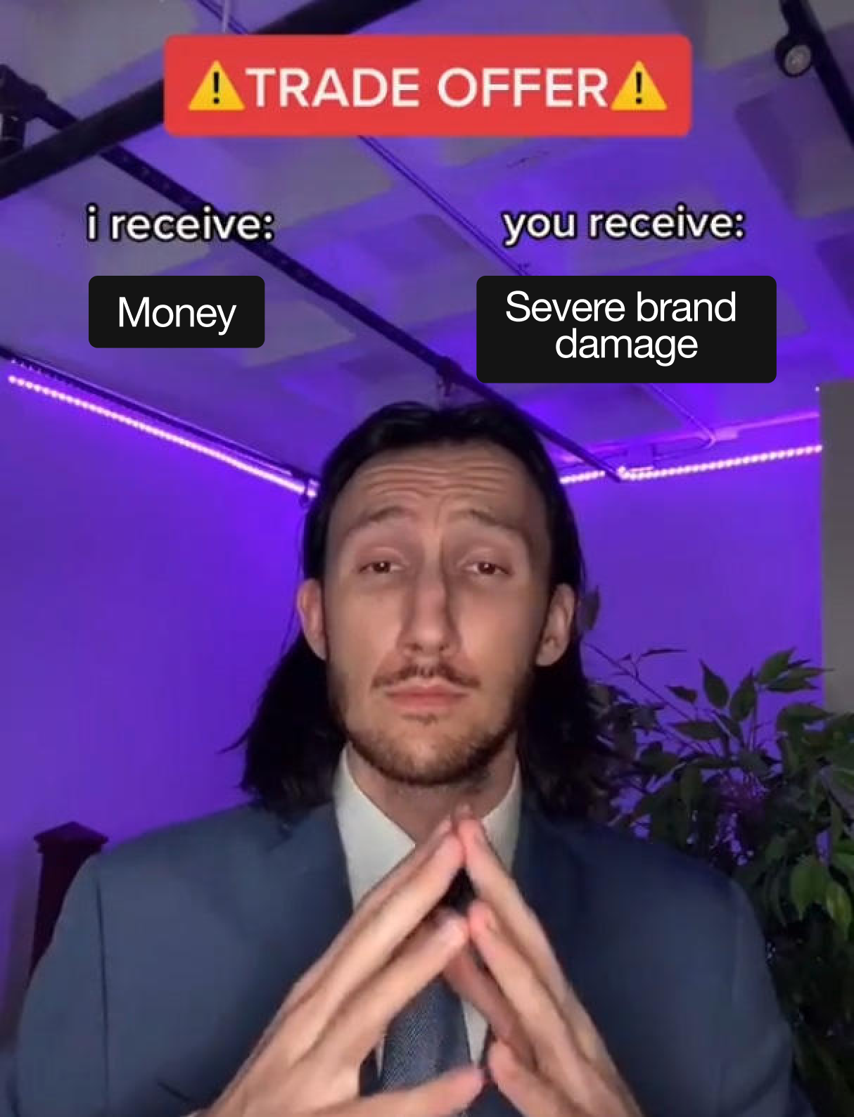 Lo particularmente alevoso es que estas ofertas son presentadas a gente que apenas roza la mayoría de edad, o que tuvo acceso limitado a educación y a laburos de calidad. Este es el corazón del problema. Es un esquema predatorio que depende de una audiencia crédula que no sabe muy bien en qué se está metiendo ni cómo debería funcionar. Por eso “mil dólares al mes” y “vivo en Dubai” aparecen en la misma oración. Por eso estas ofertas tienen estéticas poco trabajadas y preceptos surrealistas.