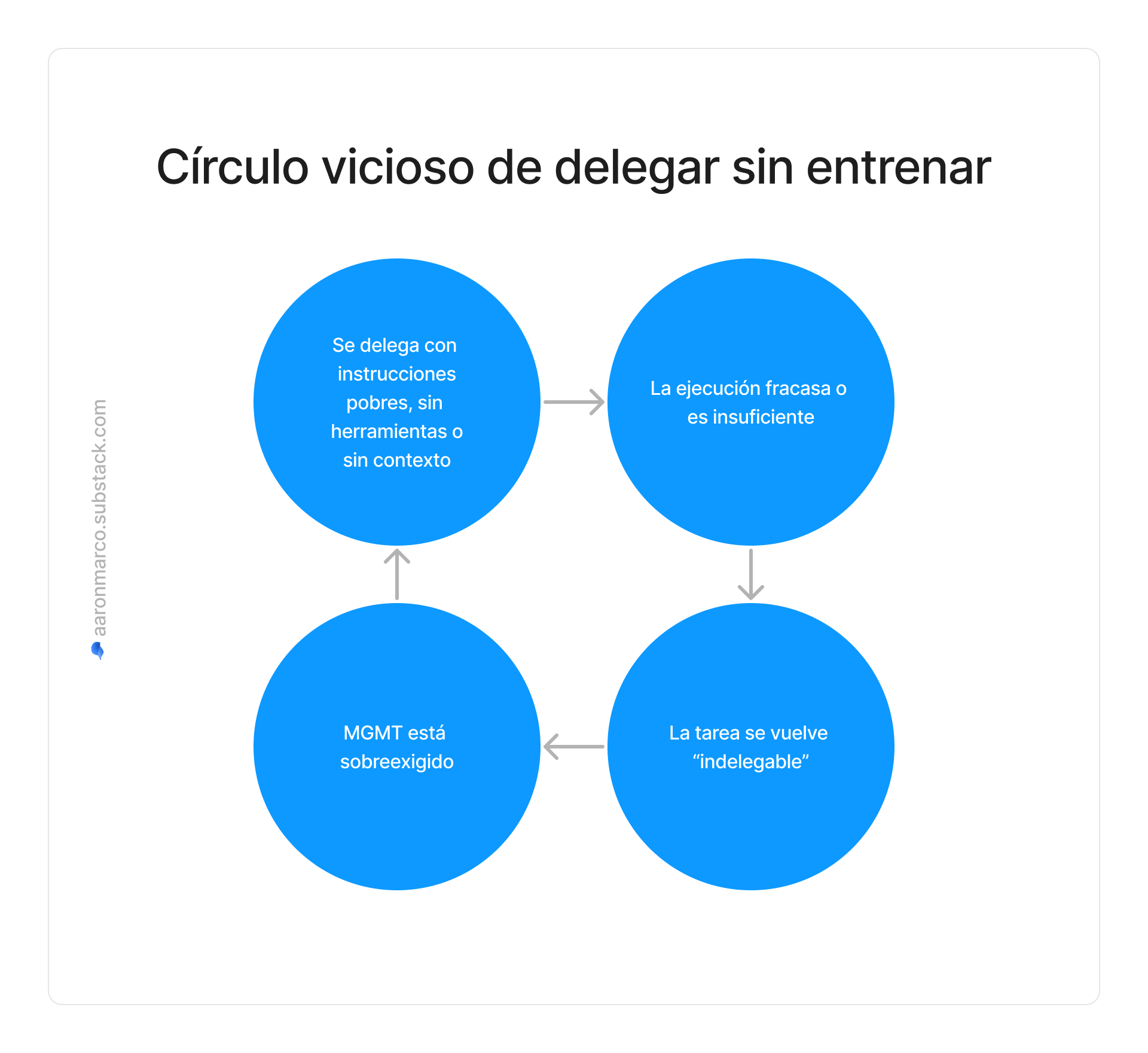 Me interesa particularmente analizar el segundo caso, en el que mgmt, para usar un dicho argentino, “se quemó con leche, entonces ve una vaca y llora”. Llamo a esto “el círculo vicioso de delegar sin entrenar”. Sus etapas son las siguientes: