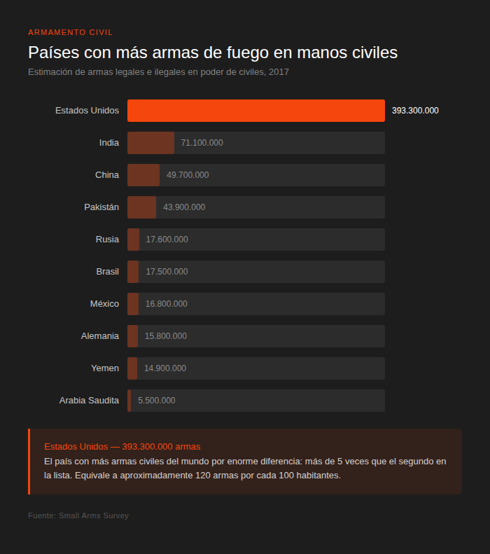 Ahora bien, si hubiese una mera proporcionalidad entre la frecuencia de Mass Shootings y la portación de armas, los países con mayor incidencia de este tipo de ataques serían los mismos que figuran en el top de tenencia de armas por parte de civiles.
