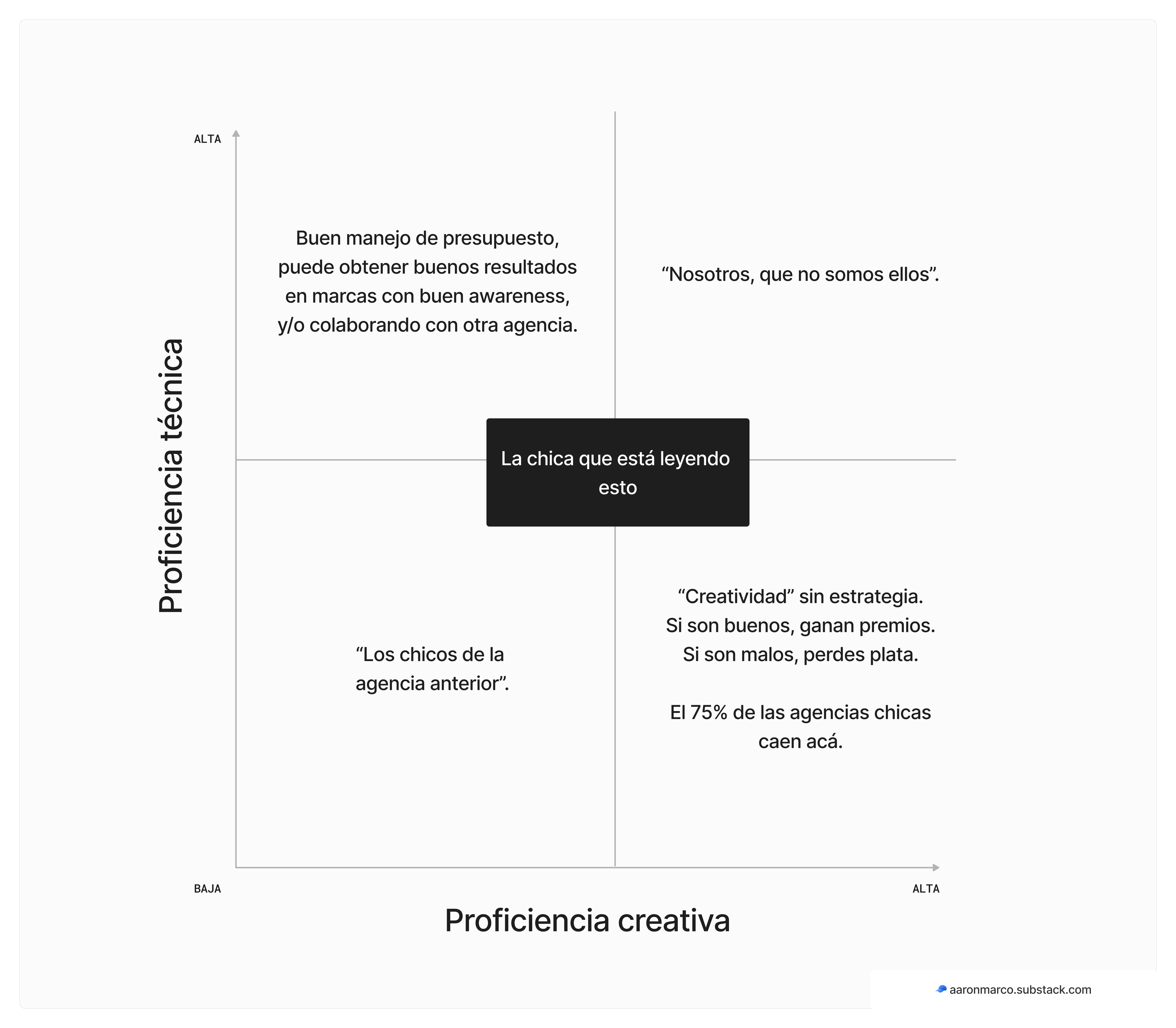 - Alta proficiencia creativa, baja proficiencia técnica - Hermosos sitios y contenido bien escrito. Ojalá hubiera ROI. Esta agencia es un taller de manualidades digitales. El 75% de las agencias chicas caen acá. Les falta proficiencia comercial - tanto para ayudar a clientes como para ayudarse a sí mismos. Estas agencias eventualmente ganan músculo estratégico o se desintegran.