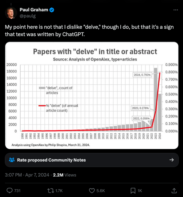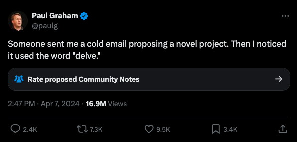 Hace unos días, Paul Graham comentó en Twitter que rechazó a un founder porque el mensaje que le escribió incluía la palabra “delve”, según Graham, signo inequívoco de que el mensaje fue escrito con ChatGPT.
