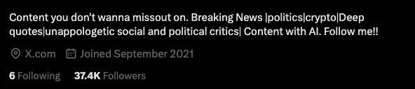 Básicamente, una cuenta con un tilde pago, que dispara contenido descontextualizado a diestra y siniestra y gana dinero con ello. Y además, es seguida por 37.4k cuentas similares.