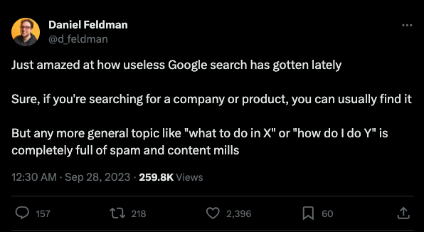 El uso de AI para generar contenido a escala viene a agravar un problema que ya habían gestado las content mills y los peores equipos de marketing de contenidos. Lo que hace que esta situación sea más grave que cualquier cosa que haya pasado con Google en los últimos 10 años es la escala y el bajo costo de producir contenido basura.