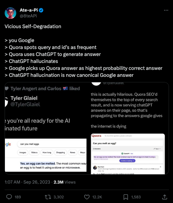 Ahora bien, Quora está usando GPT para crear respuestas a queries competitivas automáticamente. ¿Qué significa esto? Alucinaciones de AI en los primeros resultados, respuestas poco confiables, o respuestas lisa y llanamente estúpidas.