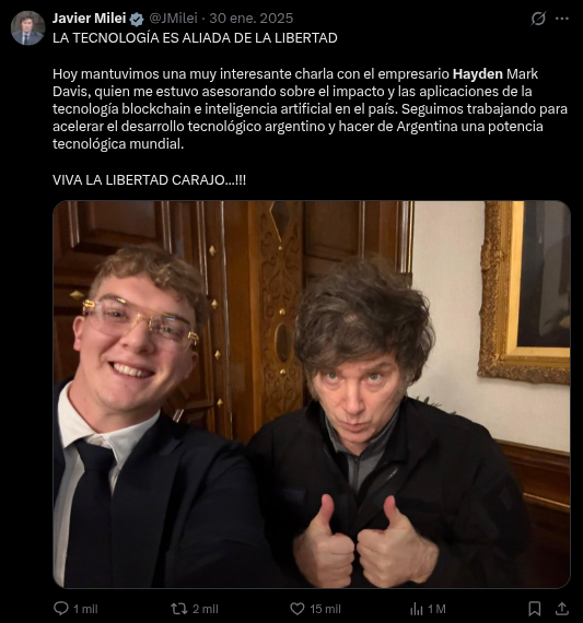 - H2 - Javier (G) Milei es un especialista en crypto y memecoins, y publicó la dirección del contrato inteligente a sabiendas de que se trataba de un pump & dump de manual, porque le servía hacer unos mangos más. Cash is king. Dotado de la seguridad que le dan su investidura y el sabio consejo de sus asesores, el 14 de febrero interrumpió su velada con Lilia Lemoine para mandar el tweet que causaría esta shitstorm.