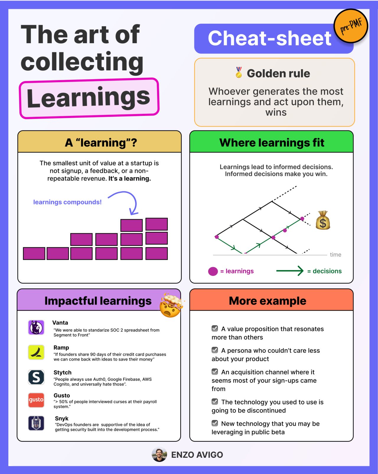 Básicamente, Enzo plantea que la mínima unidad de valor que puede generar para sí una startup es un “aprendizaje”. Este aprendizaje no es necesariamente un dato numérico. Es información real, colectada de primera mano, que inspira decisiones con un impacto positivo.